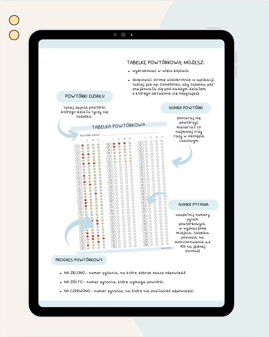 - Po zakończonej nauce pamiętaj, aby regularnie wracać do swojej tabelki i powtarzać wszystkie zagadnienia, które były oznaczone żółtym lub czerwonym kolorem.