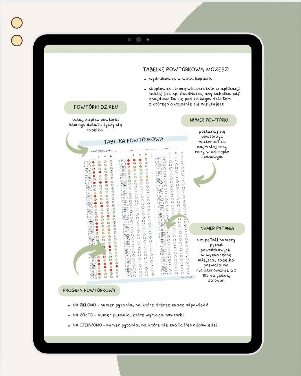 - Po zakończonej nauce pamiętaj, aby regularnie wracać do swojej tabelki i powtarzać wszystkie zagadnienia, które były oznaczone żółtym lub czerwonym kolorem.