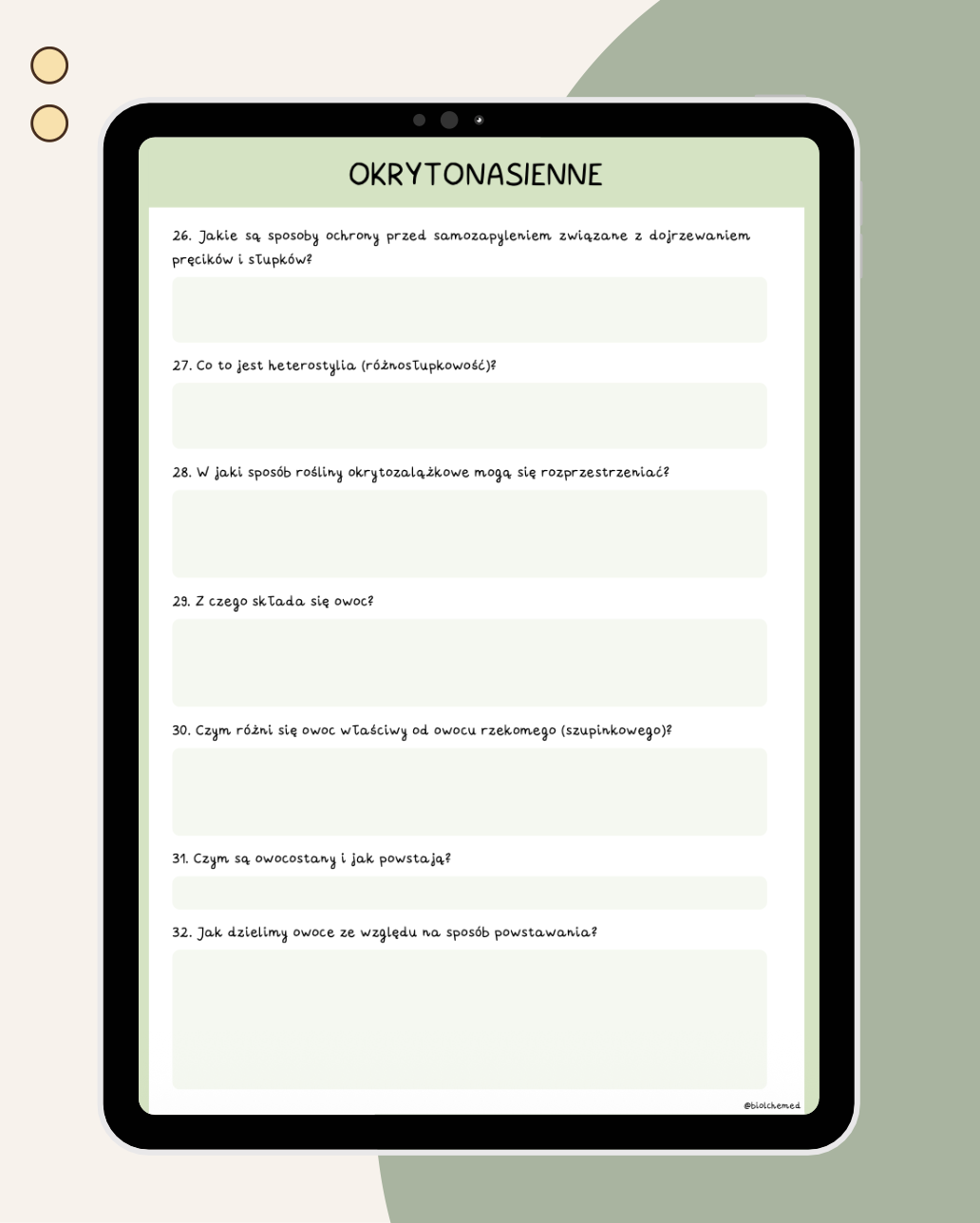 Ten produkt to PYTANIA POWTÓRKOWE + ODPOWIEDZI, które ułatwiają AKTYWNĄ NAUKĘ. Te pytania stworzyłam w oparciu o genialną metodę SPACED REPETITION, która pomaga przyswoić i utrwalić materiał. Dzięki nim zweryfikujesz swoją wiedzę i dowiesz się, do czego musisz jeszcze wrócić.