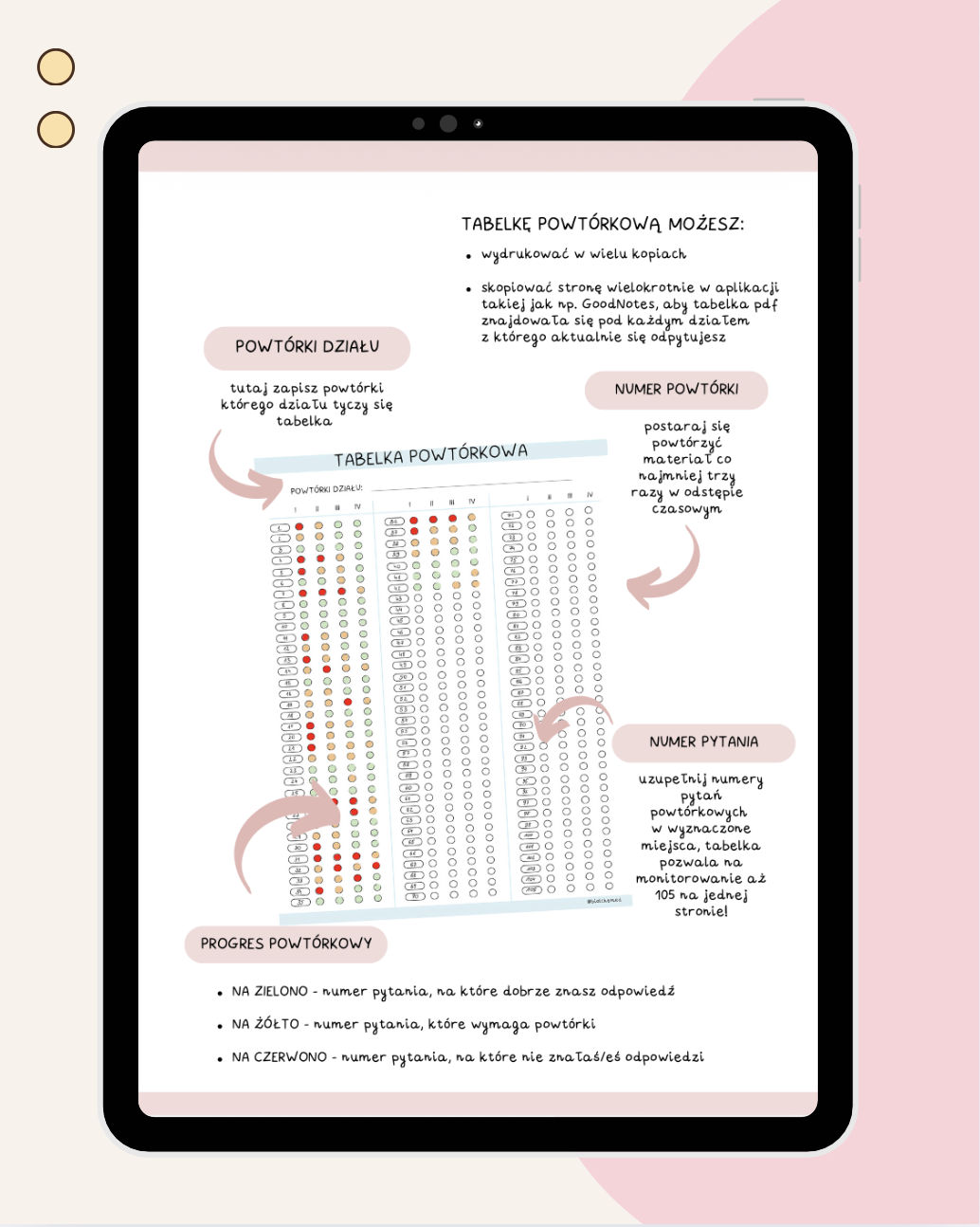 - Po zakończonej nauce pamiętaj, aby regularnie wracać do swojej tabelki i powtarzać wszystkie zagadnienia, które były oznaczone żółtym lub czerwonym kolorem.